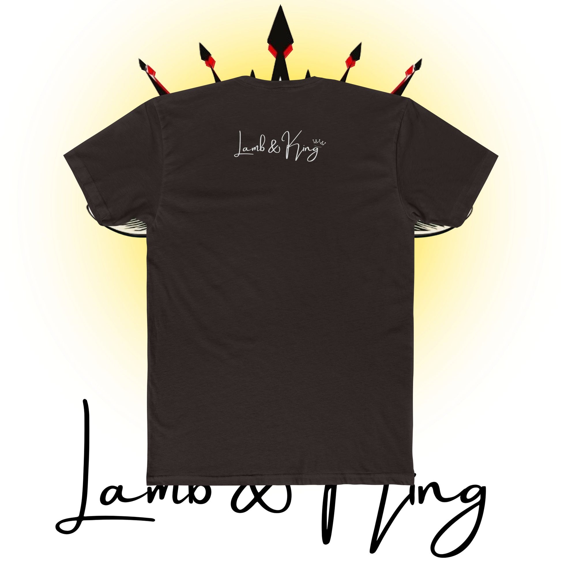 Tighten up your faithwear with the Lamb & King T-shirt. This tee features a close-up of our iconic Lamb & King logo—an image of a lamb wearing a crown of thorns and a king's crown above it, symbolizing Christ's ultimate sacrifice, kingship, and glory.